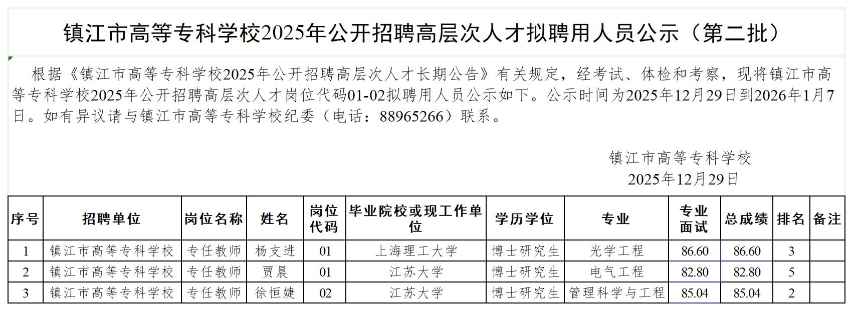 镇江市高等专科学校2025年公开招聘高层次人才拟聘用人员公示(第二批)