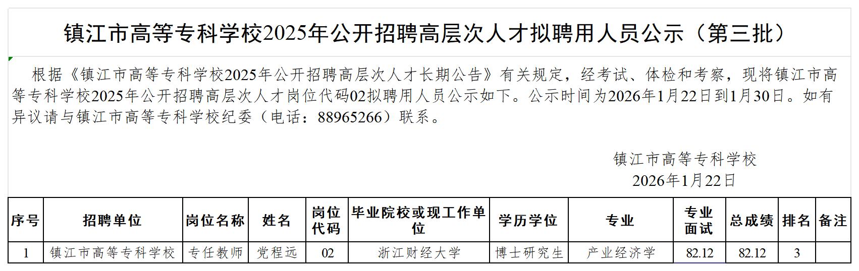 镇江市高等专科学校2025年公开招聘高层次人才拟聘用人员公示(第三批)